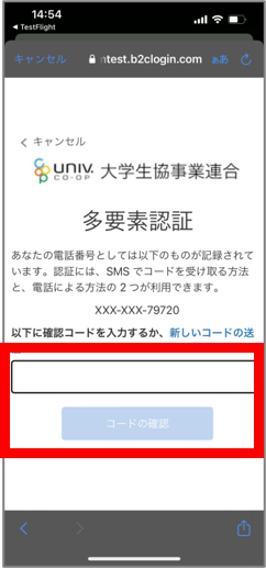 ⑬SMSに送信された確認コードを入力し「コードの確認」をタップ