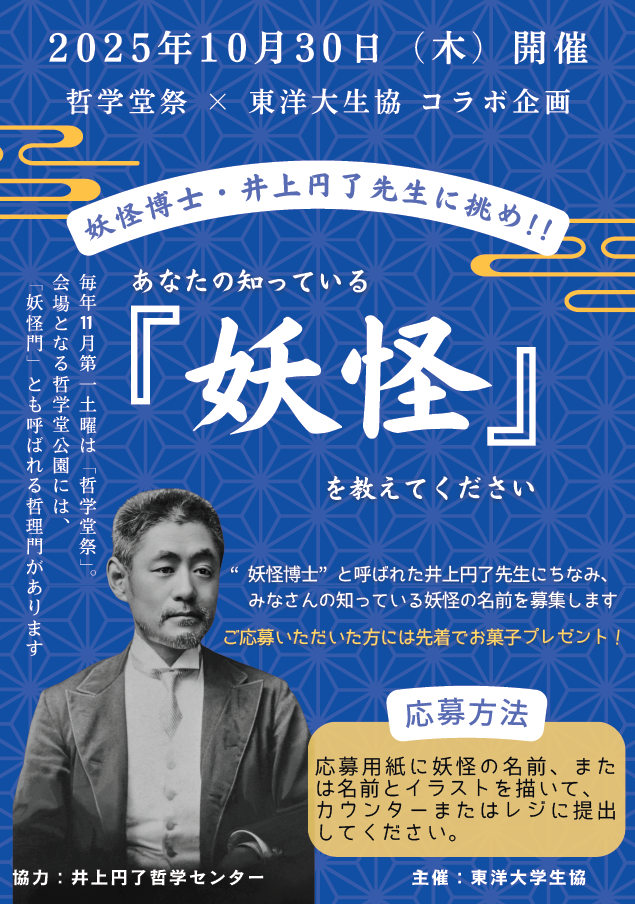この哲学堂祭開催に向けて、生協で創立者井上円了先生にちなんだ、イベントを開催します!ぜひ多くの皆さんのご参加をお待ちしております。